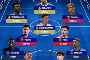 前锋:维尼修斯(皇马,1.5亿)、姆巴佩(皇马,2亿)、亚马尔(巴萨,2亿)